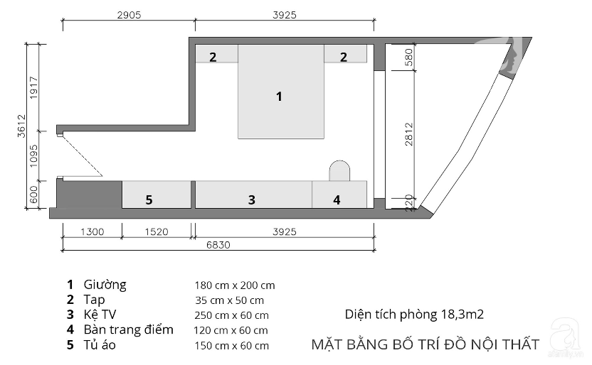 Gia đình tôi muốn thiết kế một phòng ngủ cho hai vợ chồng thật thoải mái với phong cách hiện đại, hữu dụng. Căn phòng có diện tích là 18,3m2. Với chi phí dự kiến chúng tôi có thể chi là 20 triệu đồng.